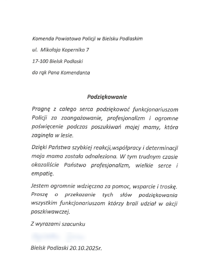 „Dzięki Państwa szybkiej reakcji, współpracy i determinacji moja mama została odnaleziona. W tym trudnym czasie okazaliście Państwo profesjonalizm, wielkie serce i empatię”.