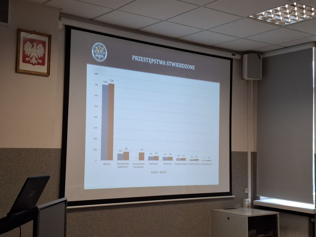 Jak wskazywały dane, w 2025 roku wzrosła liczba stwierdzonych przestępstw i wyniosła 728 ( w 2024 roku – 709). Wykrywalność ogólna przestępstw wyniosła 80,41% i wzrosła w porównaniu do roku poprzedniego o ponad 7% (w roku 2024 wynosiła 72,93%). Wskaźnik 100% wykrywalności odnotowaliśmy między innymi w kategoriach rozbojów, natomiast w wykrywalności kradzieży z włamaniem i kradzieży cudzego mienia zanotowaliśmy wyniki powyżej 60%, przy czym wykrywalność kradzieży z włamaniem znacznie wzrosła w porównaniu do roku poprzedniego. Najczęstszym przestępstwem przeciwko mieniu było oszustwo (160 stwierdzonych czynów). Stwierdzono również 40 kradzieży cudzego mienia i tyle samo kradzieży z włamaniem.