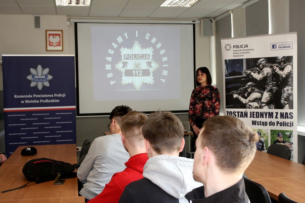 Bielskich policjantów odwiedzili maturzyści z Centrum Kształcenia Rolniczego w Rudce. Młodzież przywitał Zastępca Komendanta Powiatowego Policji w Bielsku Podlaskim podinspektor Grzegorz Bielawski, który opowiedział o specyfice pracy w poszczególnych wydziałach. W trakcie dalszej części spotkania uczniowie dowiedzieli się, jak wygląda rekrutacja do służby mundurowej. Odwiedzający przyjrzeli się wyposażeniu policjantów. O specyfice pracy w mundurze opowiadał również technik kryminalistyki. Policjant zwrócił uwagę na to, jak można trafić do policyjnej bazy danych oraz opowiedział, czym jest daktyloskopia. Następnie przewodnicy psów służbowych przybliżyli młodym ludziom, czym się zajmują oraz w jaki sposób doskonalą umiejętności swoich czworonożnych „partnerów”. Na zakończenie uczniowie obejrzeli pokaz elementów tresury psa policyjnego.